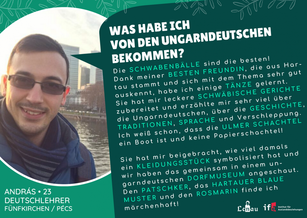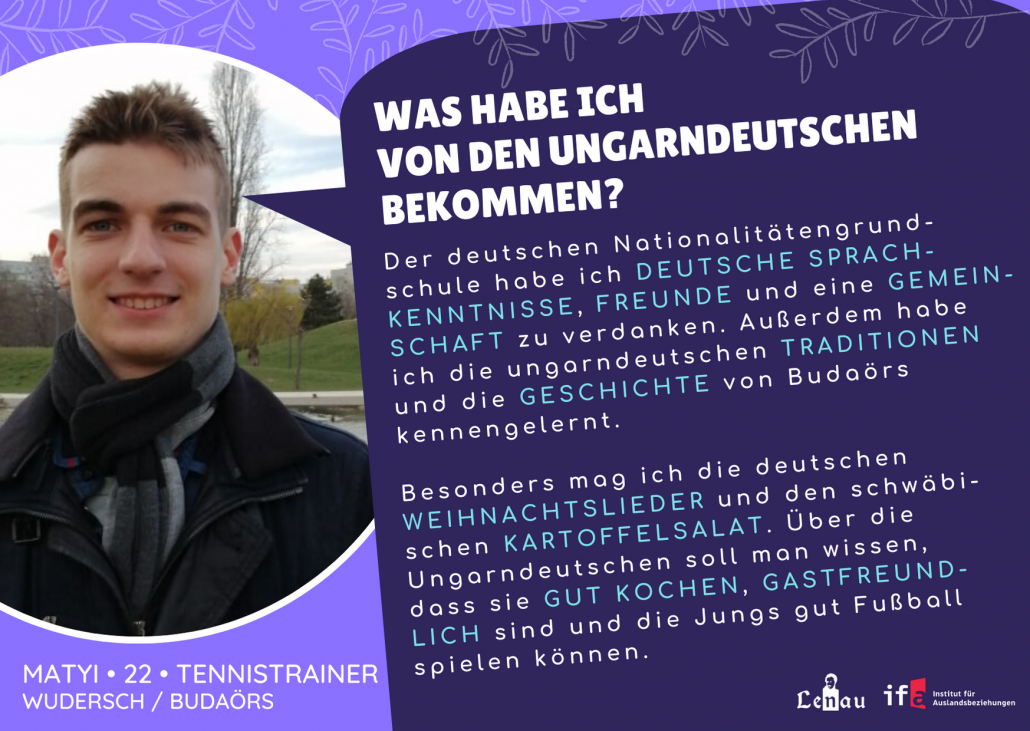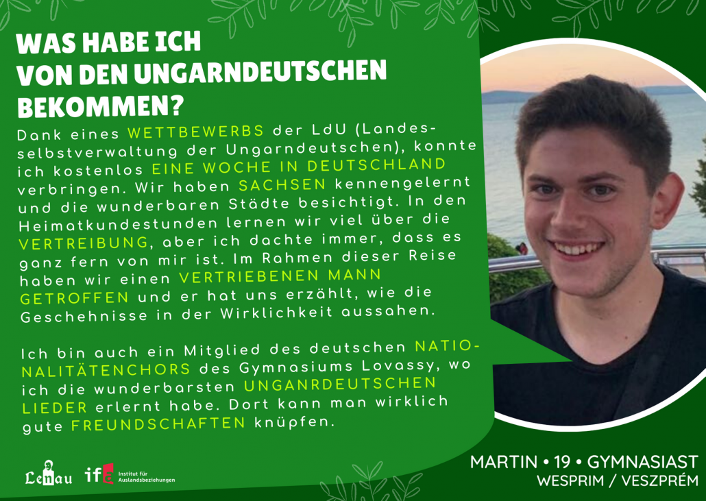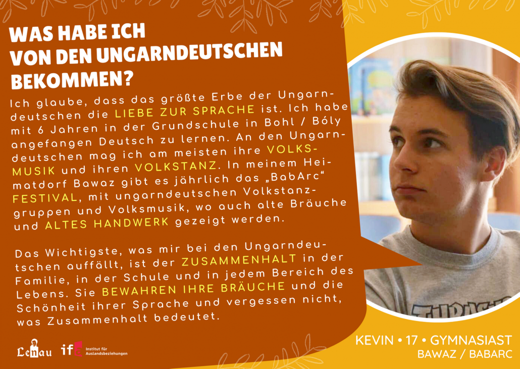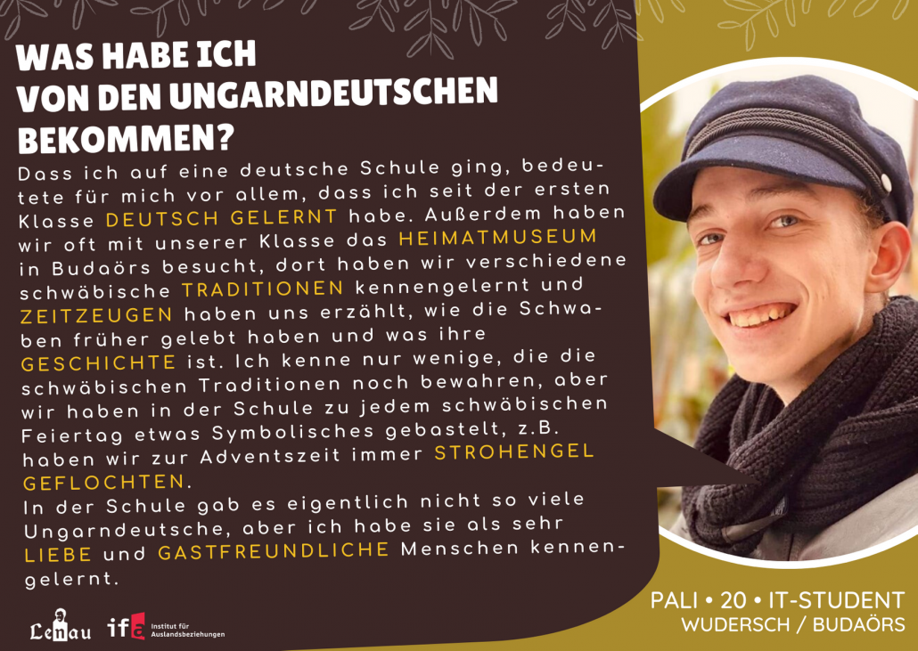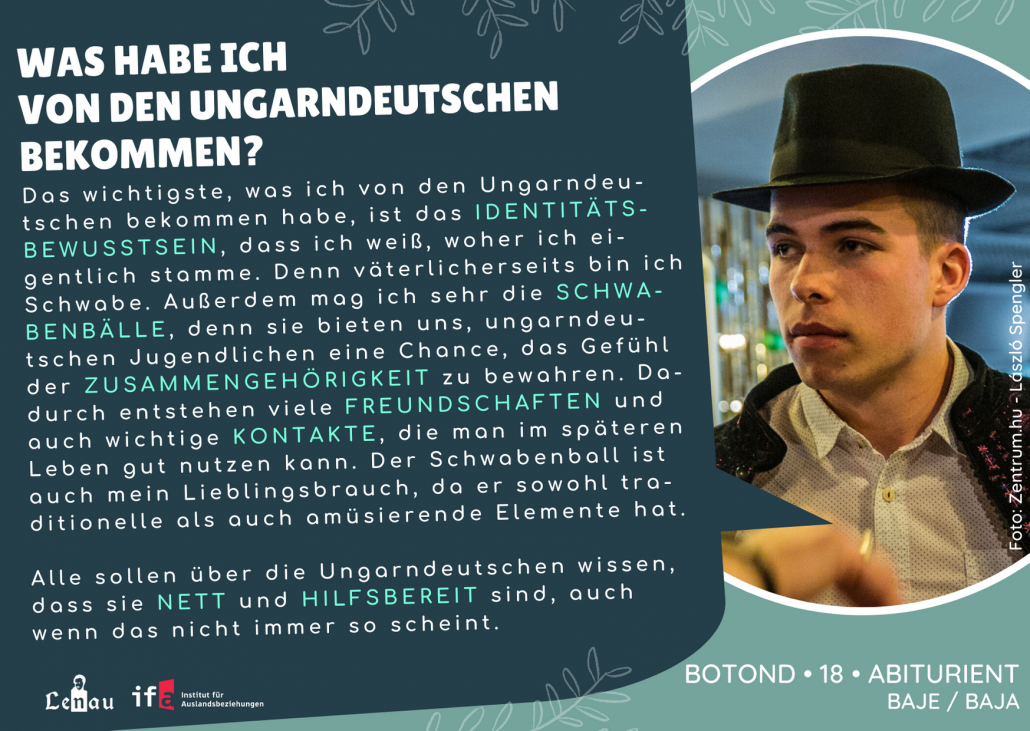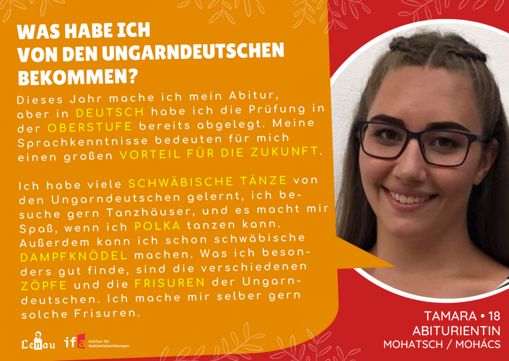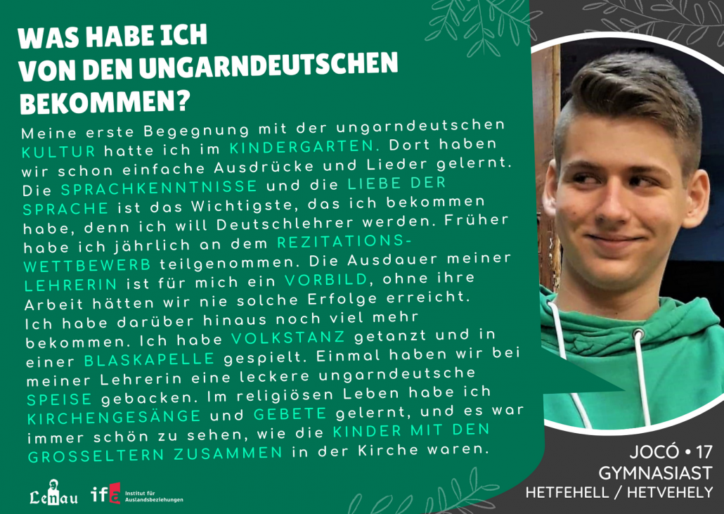 “Először az óvodában találkoztam a magyarországi németek kultúrájával, ahol már tanultunk egyszerű kifejezéseket és dalokat. A nyelvtudás és a német nyelv szeretete a legfontosabb, amit kaptam, hiszen némettanár szeretnék lenni. Korábban minden évben részt vettem a német prózamondó versenyen. A tanárnőm kitartása példamutató számomra, hiszen az ő munkája nélkül nem értünk volna el ilyen sikereket.