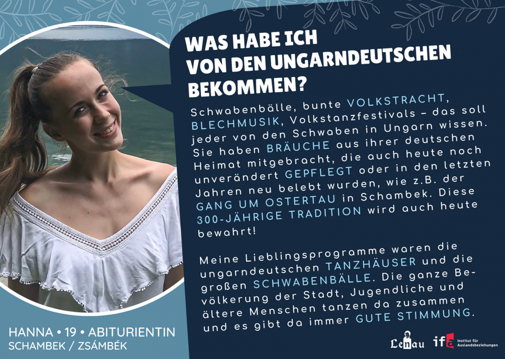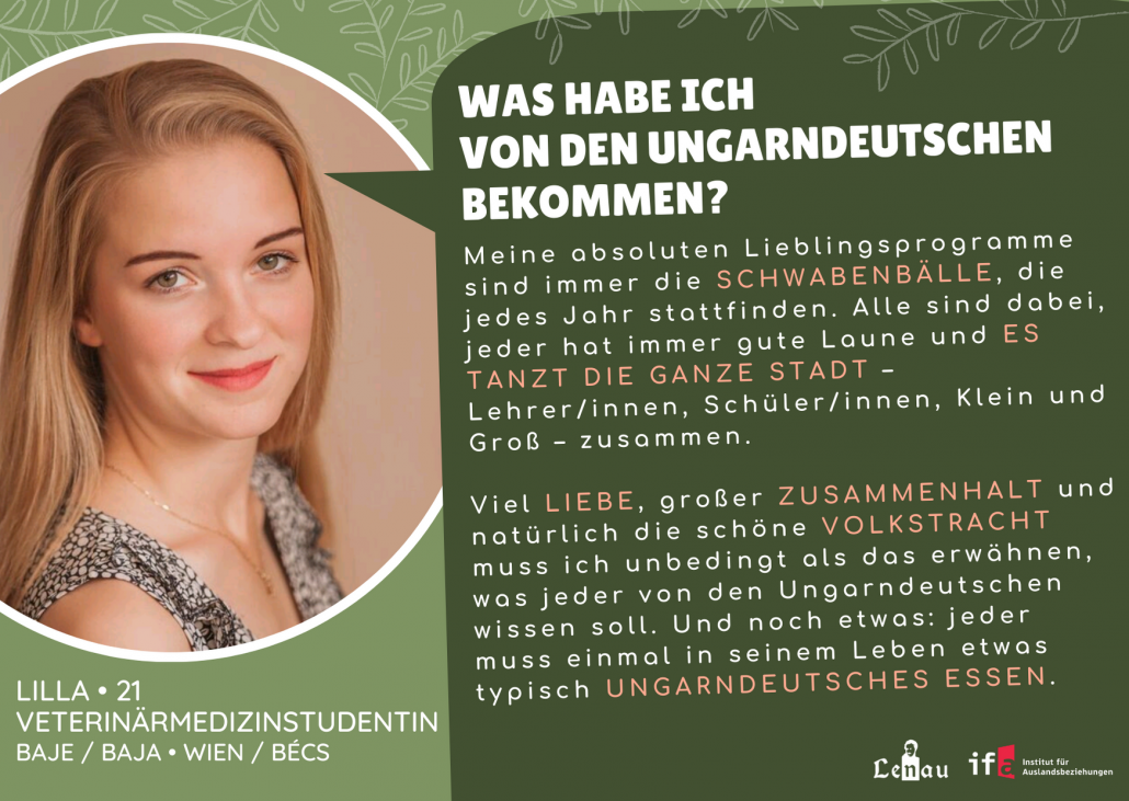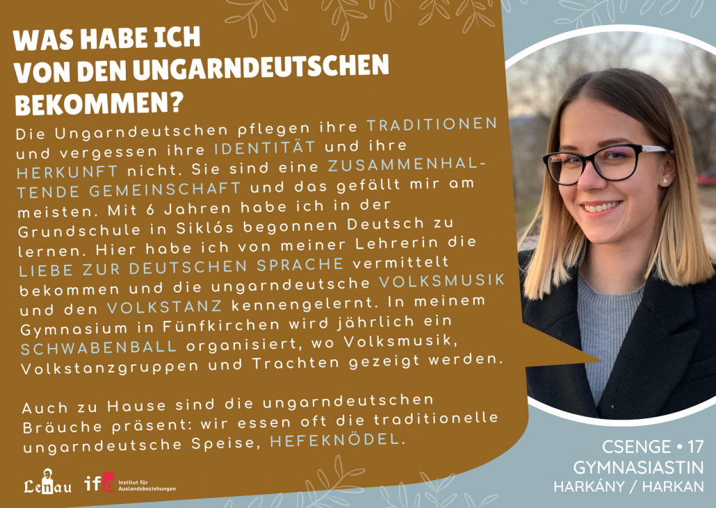 “A magyarországi németek ápolják a hagyományaikat és nem felejtik el az identitásukat és a származásukat. Egy összetartó közösséget alkotnak, és nekem ez tetszik a leginkább. Hat évesen kezdtem el németül tanulni az általános iskolában Siklóson. Itt adta át nekem a némettanárom a német nyelv iránti szeretetet és itt ismertem meg a német népzenét és néptáncot. A pécsi gimnáziumomban évente rendeznek egy svábbált, ahol népzenét, néptánccsoportokat és népviseletet mutatnak be.