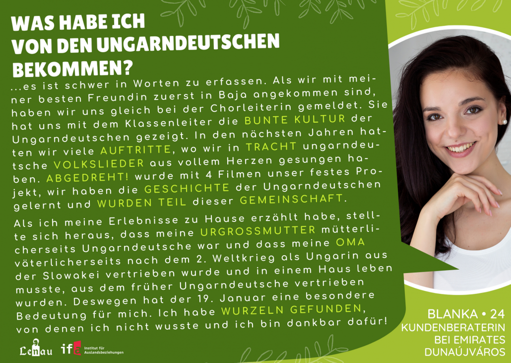Amikor az élményeimet elmeséltem otthon, kiderült, hogy az anyai dédnagymamám magyarországi német volt, és hogy az apai nagymamámat a második világháború utána magyarként kitelepítették Csehszlovákiából és egy olyan házban kellett élnie, amelyből korábban magyarországi németeket üldöztek el. Ezért január 19-ének számomra különös jelentősége van. Olyan gyökereimre találtam, amelyekről nem is tudtam, és ezért hálás vagyok!”
