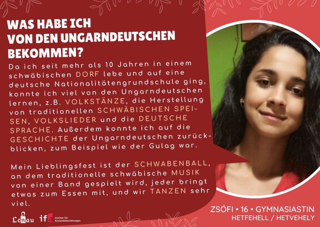 “Már az általános iskolában sokat tanultam a magyarországi németekről, és szerencsére ezt folytatom a Lovassy Gimnáziumban is. Nagyon érdekelnek a hagyományaik, amelyekről sokat tanulunk a népismeret órákon. Van néhány osztálytársam, akiknek magyarországi német gyökereik vannak, velük gyakran járunk a szülőfalujukban megrendezett svábbálokba. Nagyon szeretem ezeket a rendezvényeket, mindig fantasztikus a hangulat.
