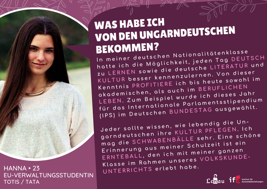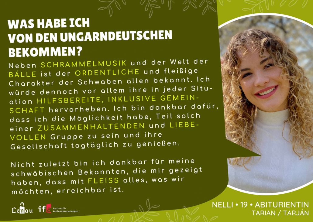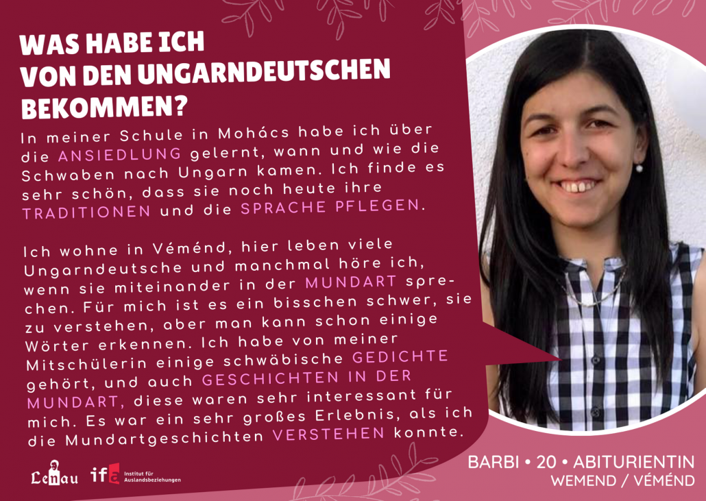 “Apai ágon magyarországi német vagyok és ez megtiszteltetés számomra. A nagymamám a mai napig svábul beszél velem, a nyelv szeretetének fontos szerepe van nálunk. Majdnem minden évben részt vettem az országos vers- és prózamondó versenyen nyelvjárás kategóriában.